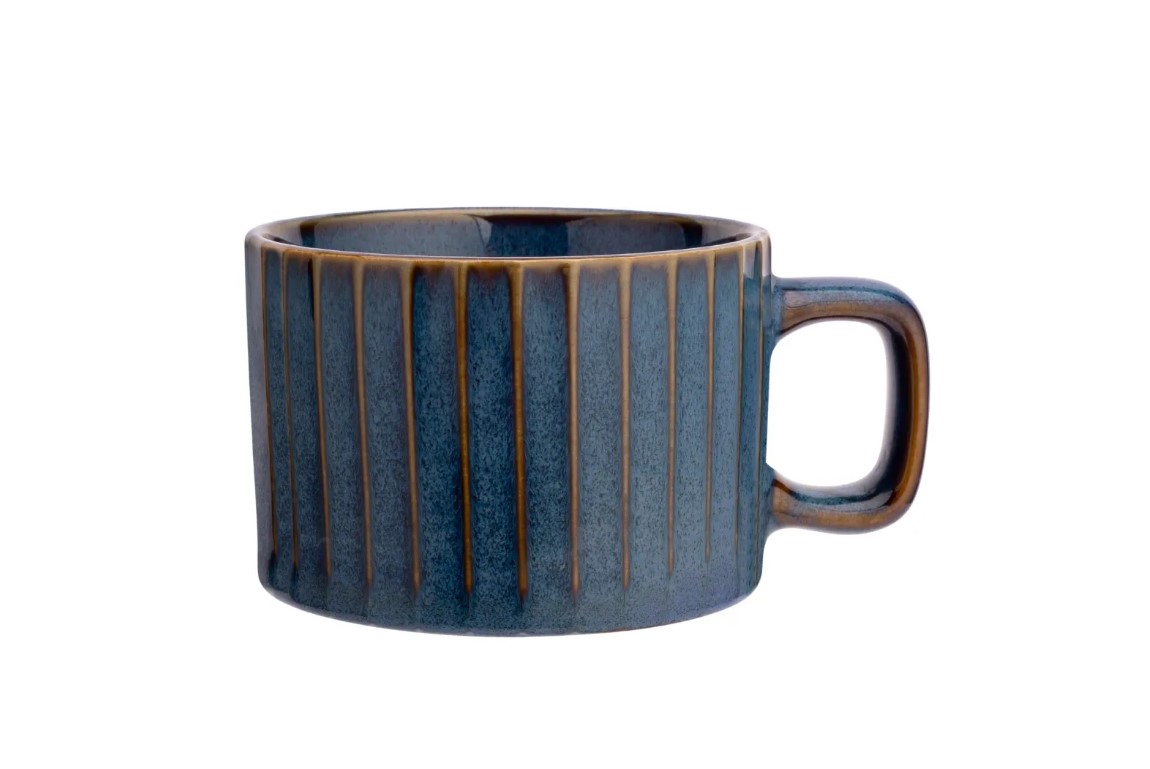 Kohvitass mille eripära kollased triibud ja erinev sinine toon muudavad peolaua eriliseks.