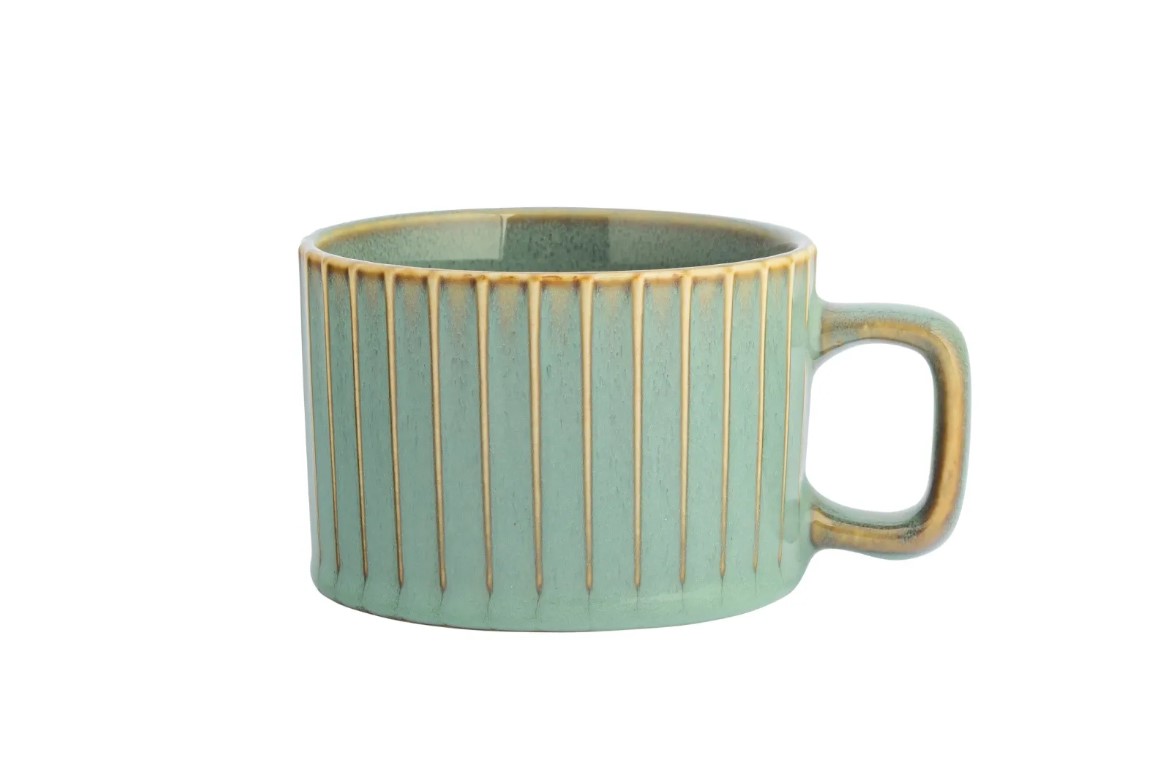 Kohvitass mille eripära kollased triibud ja erinev roheline toon muudavad peolaua eriliseks..