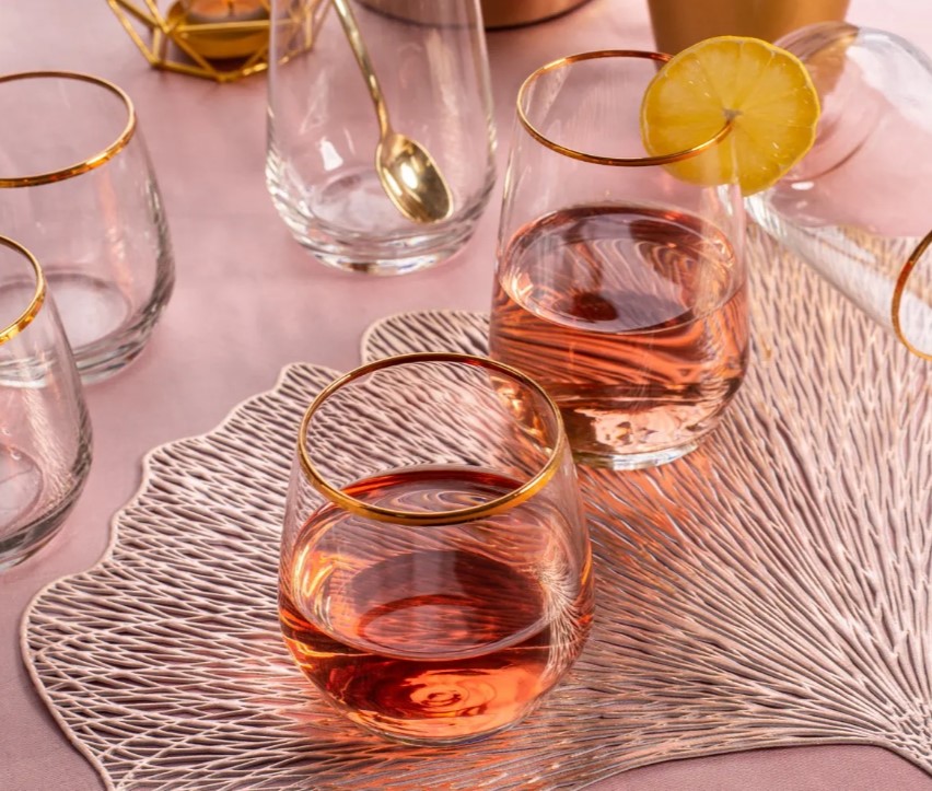Stiilne ülevalt kuldse ringiga pokaal mida sobib kasutada vee, valge veini, kui punase veinipokaalina..